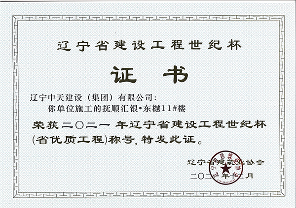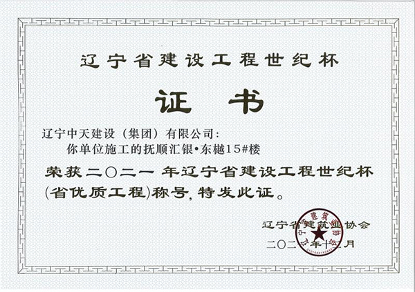遼寧中天建設集團領導班子認真貫徹落實科學發(fā)展觀,堅持以人為本,積極培育“開拓進取,求新向上,求真務實,團結奉獻”的企業精神和“干一項工程交一方朋友,占一方市場,樹一座豐碑”的經營理念。經過遼寧中天建設者的辛勤耕耘,許多建筑精品工程象一座座豐碑聳立在撫順大地上,令人矚目。撫順市保障性住房建設工程榮獲全國優(yōu)質工程金獎,撫順移動通訊綜合樓、撫順市電信綜合樓、撫順市三寶屯污水處理廠擴建及中水回用工程等多項工程獲得“遼寧省世紀杯工程”、“遼寧市政金杯”工程等殊榮。公司還多次榮獲“省建筑業質量管理先進施工企業”稱號。